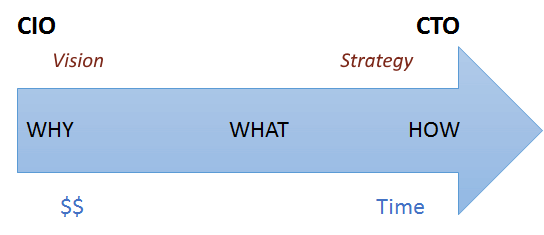 The CIO is more focussed on the business justification of projects and investments, they both agree on what to do (vision turning into strategy), and the CTO would make it happen by enabling the appropriate technology. Lastly, the CIO sits on the budget, the CTO is accountable for time & resources.